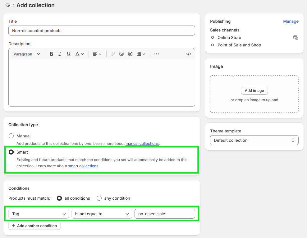 - Products → Collections → Create collection → give it a title (e.g., “Non-discounted products”).